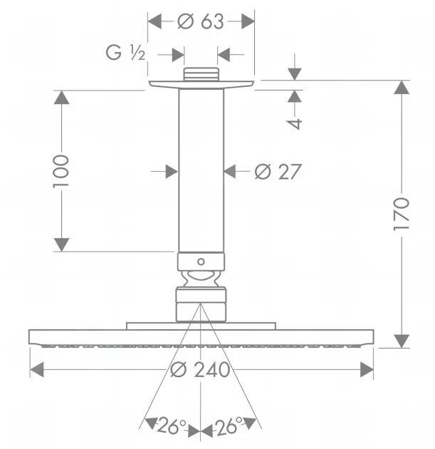 De Hansgrohe Raindance S 240 Air 1jet heeft een plafondbevestiging (100mm) en is bijzonder geschikt voor een probleemloze modernisering en veredeling van de doucheruimte. De grote douchekop geeft veel plezier bij het douchen. RainAir hult uw lichaam in een royale waterstroom – een luxe gevoel voor een heerlijke rustpauze in de dagelijkse drukte. Dankzij het kogelgewricht kunt u de hoek van de douchekop eenvoudig instellen.