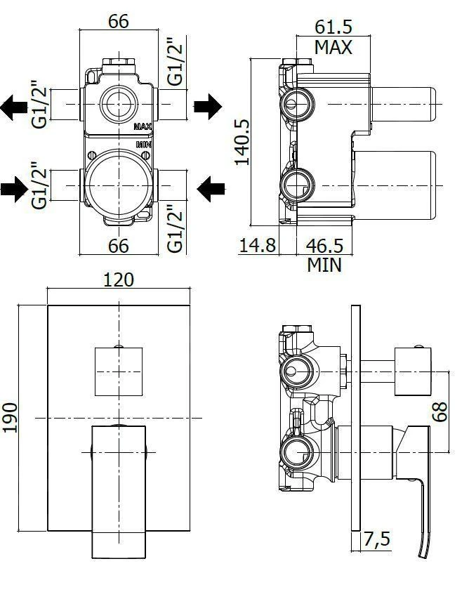 Eengreeps douchekraan met draaibare omstelling incl. inbouwdeel voor 2 uitgangen