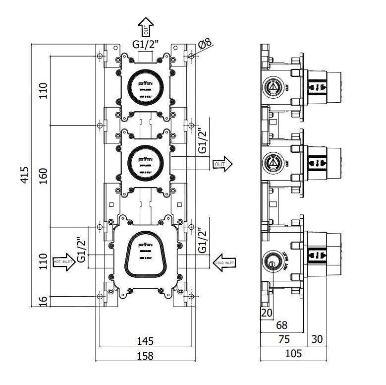 - bij horizontale installatie moet de thermostaat rechts worden geplaatst